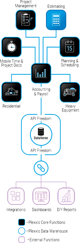 –Plexxis Core Functions –Plexxis Data Warehouse –External Functions API Freedom API Freedom Accounting& Payroll DIY Reports Dashboards Integrations DataVerse HeavyEquipment Mobile Time & Project Docs ProjectManagement Residential Estimating Planning &Scheduling